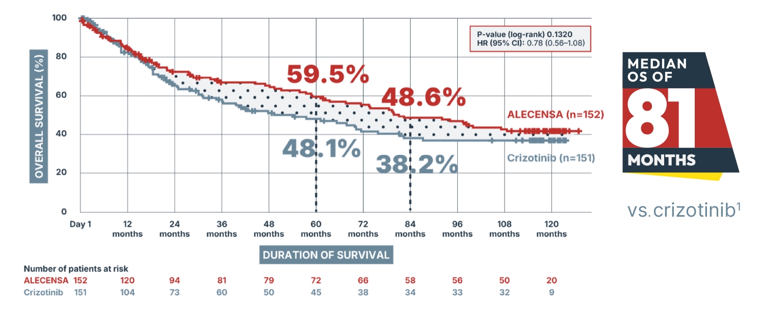 94 months with ALECENSA vs. 69.8 months with crizotinib (HR: 0.87; 95% CI: 0.58–1.32)